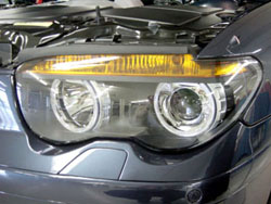 【Report by 玉テク】 電圧安定機を装備し、各バルブの寿命を延ばしている。ストップランプにはLEDを採用し、 点灯反応速度と輝度が増しているようだ。 また、各バルブには未使用時も微弱電流を流して異常がないかチェックしている。 異常の際は、代替えのランプが機能する仕組みだ。 (例えばポジションランプが消えるとウインカーが代替えで点灯) 【Report by 中橋】 ヘッドライプはバイキセノンヘッドライトを装備し、ロービーム、ハイビームともキセノンです。 いわゆるイカリングデザインにまゆげのようなウィンカー。 完全に新しいBMWの顔を演出してます。 かっこいいです。 このランプはオプションでオートマチックヘッドライトになります。 周囲の明るさ、降雨、降雪などを検知してオンオフを自動制御できるとのこと。 この車を選ぶなら設定したくなるオプションですね。 |