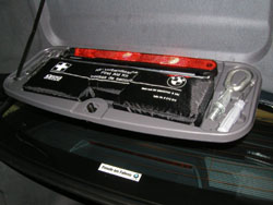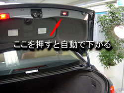 【Report by 玉テク】 容量は500リットル。電動開閉が可能であり、キーまたはトランクのボタンを押すことに より自動開閉する。トランクのリンク部は至って単純な構造(写真)でRをもつパイプ状の ものとなっている。 挟み込み防止機能もあり、実際に体を挟んでみたがかなり敏感に反応したので、 これなら安心である。 ヒューズBOXはトランク右側に設置される。 【Report by 中橋】 トランクの左側はナビゲーションがインストールされます。 トランクをあげたときの赤い照明も視認性が高い位置に設置されています。 またBMWお約束の工具入れもちゃんと設置されています。 ただ、かなりメンテナンスフリーな設計のため、使う人がいるかどうかはわかりません。 ゴルフバックが4個、横に楽に入る大容量のトランクでした。 トランクルームの高さをとっている割に違和感のないデザインにまとめた デザイナーにも感心です。 ちゃんとフルサイズのスペアタイヤも埋め込まれていました。 |