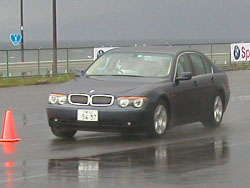 【Report by 玉テク】 新しくアクティブ サスペンションの構成として、3つのシステムが連動している。 ダイナミック ドライブ、EDC-Cダンパー、ニューマチック サスペンションがそれぞれダイナミックにマッチング して動作する仕組みである。 ダイナミック ドライブは、市街地などでは、最大0.3Gの横Gまでは、100%ボディロールを 抑え、ワインディングなどでは、最大0.6Gまでまで、80%以上のロールを抑えるらしい。 EDC-Cダンパーは、路面状況や、走行状態により減衰力を無段階にコントロールし、 スポーツモードとコンフォートモードの切替もiDriveのメニューより変更が可能になっている。 また、ニューマチックサスペンションは、車輌の積載量に関係なく、スプリングの動作範囲 を一定に制御することにより、キャンバー、キャスターの変化を抑え走行安定性を保つ ようになっている。 −−スラロームしてみました 路面はウエット、パイロンは20m〜22mくらいに不等間隔で置かれているコースでダイナミック ドライブ装着車(735i)、非装着車(735i)、メルセデスベンツS320の3台をそれぞれ 試乗してみました。 まずは、ダイナミック ドライブ装着車でスタート。速度は約45km/hで進入、切りはじめ一発目 から軽いステアリングと相まって車はスッと1本目のコーンをクリアします。すぐに2本目のターンの 為ステアリングは一気に反方向へ切り込みます。ここで、普通なら1.9トンものボディの過重移動 で相当なボディーロールが発生するところ、しかしこの車に至ってはフラット。ほとんどロール感 なく鋭くターンしていきます。この感は3シリーズ並みの軽快感と、かなり引締められたサスを 持つ車の感じです。プロの方の同乗では50km/hにてスラロームしましたが、4名乗車にも かかわらずスパッ!スパッ!と車はターンして行きました。乗っていると7シリーズと思えません。 いや、これぞ最新7シリーズなのですが。(笑) 次は、ダイナミック ドライブなしの車輌に乗りました。こちらは至って自然な感じです。先の 装着車が不自然とは言いませんが、ロールしないのでステアリングだけで曲がる感じの操縦 になります。さて、こちらもステアリングは軽く、ターンではノーズがスッと入っていくとともに、今度 はしっかり踏ん張りながらもロールしていきます。そしてロールと共にキャンバー変化も手伝い車は 回り込んでいきます。この足の方が玄人受けするセッティングかもしれません。 最後に、こちらも初乗りのメルセデスベンツS320。最近街でよく見かけるので気になってました。 乗った感想は、スラローム・・・やって面白くありません。ロールはたっぷりとしますし、何かにつけ 操作系ならびにそれに対するレスポンスがゆったりしています。決して曲がらないわけではない ですが、たっぷり、ゆったりといったフィールで車は動きます。プロの方の後部座席で735iと 同様に50km/hで走ってもらったら、体が左右に吹っ飛んでしまいました。ボディも運転している とこちらが大きい感じがします。全長以外ほんとは小さいのですが。。 ダイナミック ドライブ装着車、非装着車の価格差はダイナミックパッケージとしてオプション扱い で40万円。人を乗せて走る方にはフラットな乗り心地で、絶対に装着して損はないでしょう。 乗り比べると違いは誰でもわかる程のものですので、是非試乗されることをお奨めいたしますね。 【Report by 中橋】 運転席では、雨の中、高級車、スラローム、という状況で恐る恐るしか運転しなかった のですが、それでもダイナミックドライブ装着の有無はわかりました。 特にこの車の後ろでゆったりしたい人は、乗り比べて選ぶ価値があるかと思います。 荷重移動しながらグリップをたしかめうんぬん、という運転をしない人には、 常に車体のスタビリティが前後左右にずれない電子制御のすごさを享受できるはずです。 インストラクターの運転&後ろでくつろく僕、という状況下では信じられない速度で ぐいぐいまがるのにロールしないスタビライザー制御と、運転技術に驚きました。 (さすがBMWドライバーズスクールの講師だわ・・・。) Sクラスを買うなら7シリーズの方がいいなと、思いますよ。 巨大な7シリーズが駐車場に入るかどうかだけは事前に確かめないといけませんが。 |